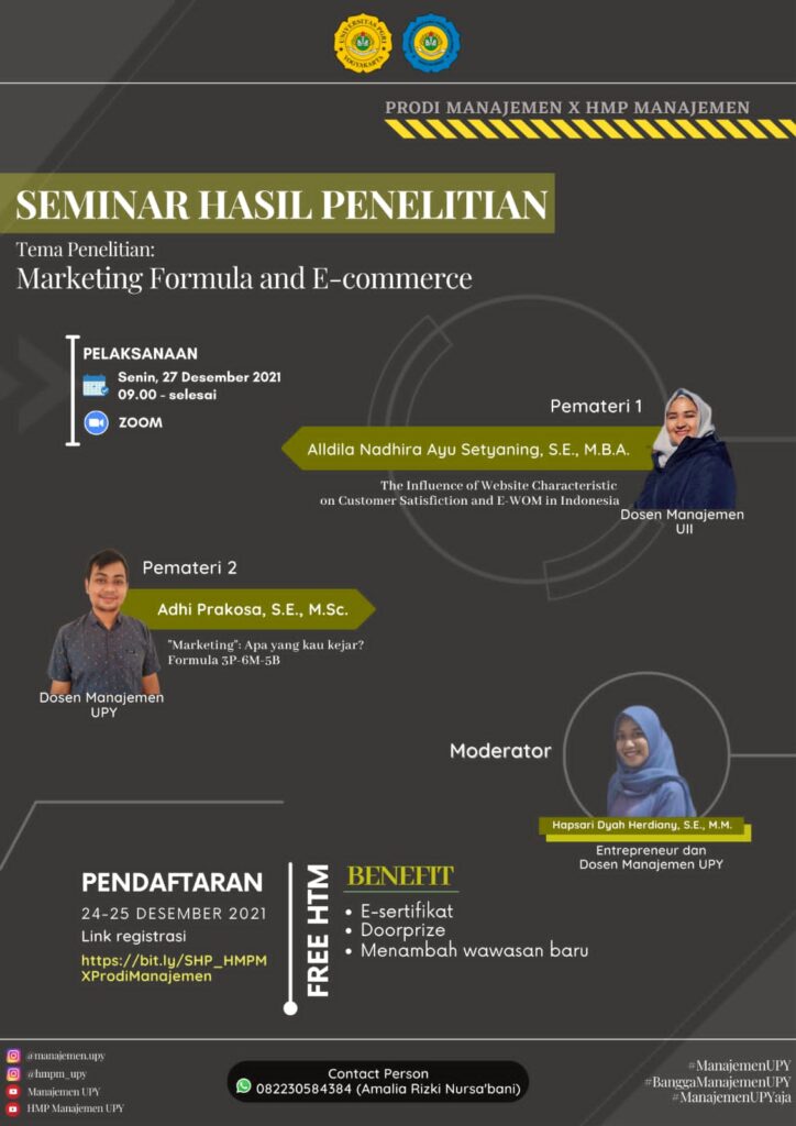 Senin, 27 Desember 2021 terlaksana kegiatan Seminar Hasil Penelitian (SHP) yang ke-2 diadakan oleh Program Studi (Prodi) Manajemen yang berkolaborasi dengan Himpunan Mahasiswa Prodi (HMP) Manajemen. Pada acara SHP ini, mengangkat tema “Marketing Formula & E-Commerce”. Pengisi materi berasal tidak hanya dari dosen Program Studi Manajemen Universitas PGRI Yogyakarta (UPY), tetapi juga dari luar.